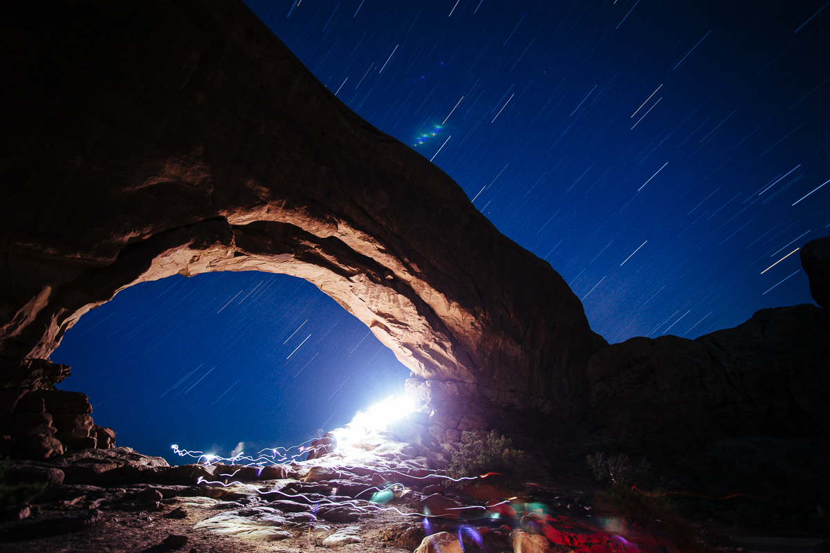 18 second exposure in Arches National Park, Utah. The light trails are from people leaving the arch and passing by me. The bright light in the arch is from someone using large flashlight and often shining it towards me.